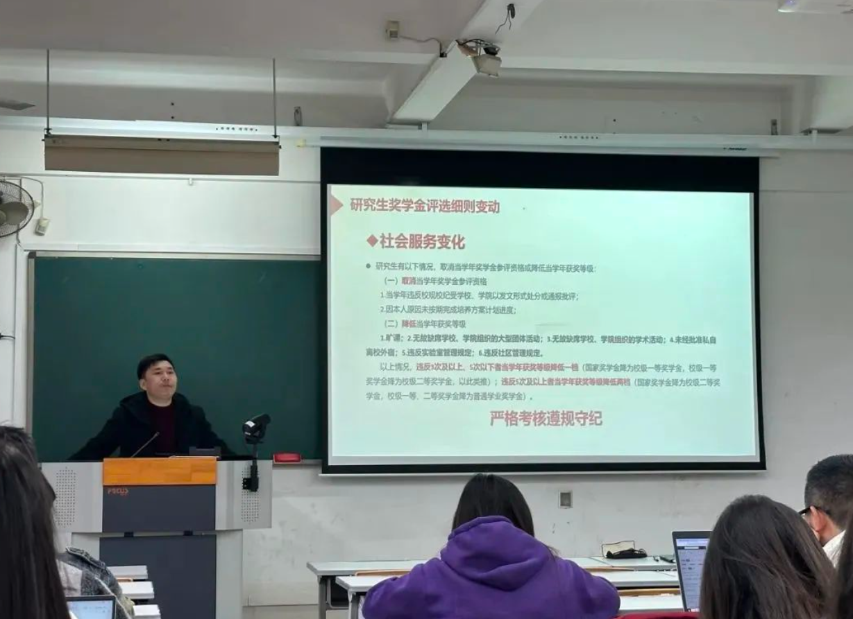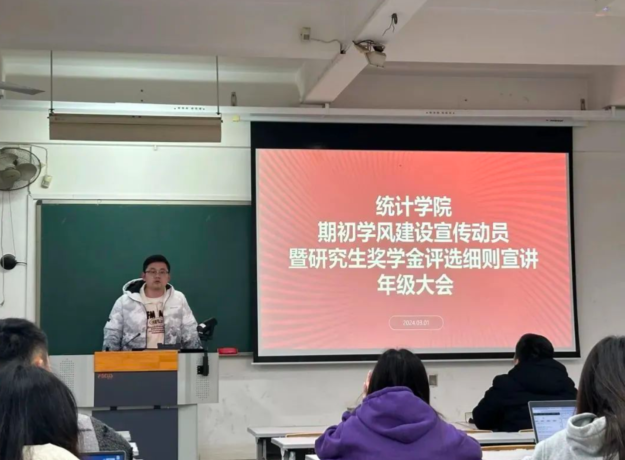 大会伊始,黄东强调新的学期要展现新的学习风貌,制定新的学习目标,持续创建“无迟到、无旷课课堂”“无餐饮教室”“无作弊班级”。他提醒接下来将进入赛事、论坛的集中开展期,要及时关注相关参赛、参会信息,鼓足干劲创佳绩。随后,他详细解读了统计学院新版研究生奖学金评选细则,重点强调了评选环节学生应该注意的细节、出现的误区,总结了往年研究生奖学金评选工作经验,对学生在申请过程中可能遇到的各种问题进行了详细地举例说明。