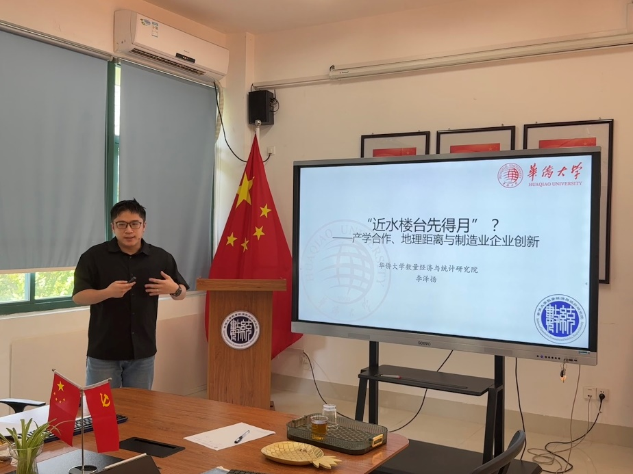 2025年7月8日,“中国式现代化”主题学术研讨会在华侨大学数量经济与统计研究院F5-308会议室成功举行。本次研讨会邀请了西南财经大学徐静教授、北京师范大学方胜副教授、中山大学邓贵川副教授、苏州大学商学院范尧尧副教授等多位青年学者莅临我院参与学术汇报与交流研讨。会议由我院李泽扬副教授主持,分上下午两个半场进行,我院林木材副教授、杨广亮副教授与全体博士研究生参加了本次研讨会。与会学者围绕中国经济转型、住房财富效应、产学合作创新、就业结构服务化、基金投资者利益等诸多议题展开深入讨论,为理解和推进中国式现代化提供了重要的学术支撑。