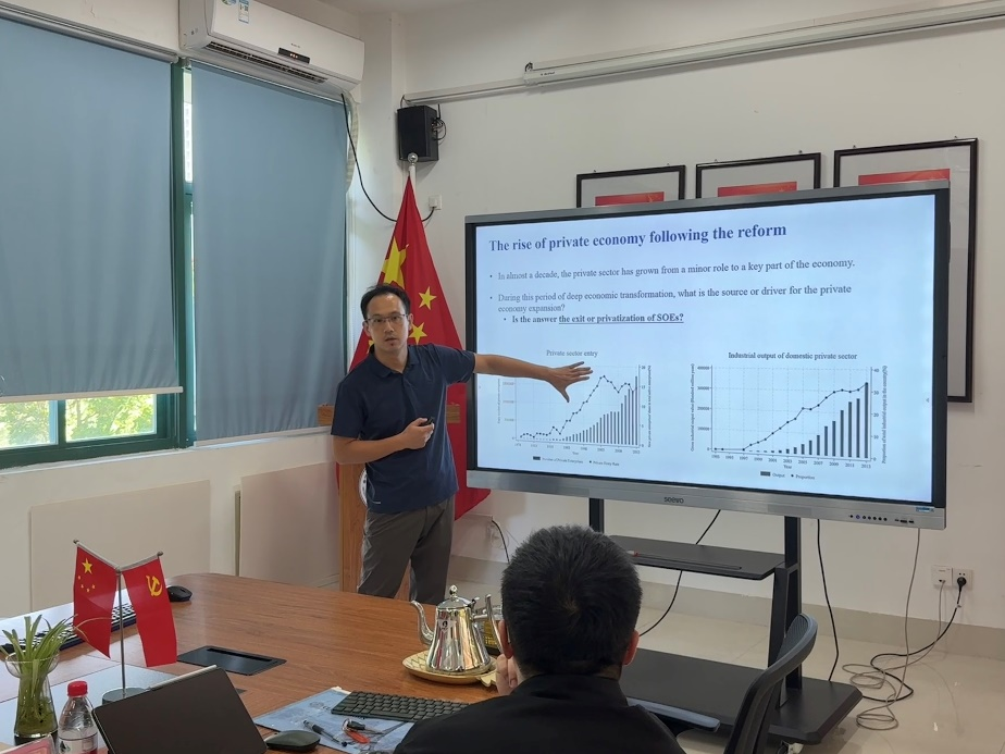 在上午的会议中,方胜老师率先汇报《The Origins of Private Sector Entry in China's Economic Transformation》,报告引发热烈讨论,与会学者就集体企业退出的时间节点、地理因素对企业进入的影响、研究方法和数据来源等问题展开深入交流。随后,徐静老师汇报《Housing Wealth as Buffer for Old Age under Limited Mobility Rights, Credit Constraints, and Debt Aversion》,与会学者就户籍制度演变的历史影响、沿海与内陆地区的差异表现、内生性控制、样本代表性等技术问题进行了深入探讨。最后,我院李泽扬老师汇报《“近水楼台先得月”?——产学合作、地理距离与制造业企业创新》,与会学者围绕地理邻近与制度环境的关系、企业规模和所有制对创新效应的影响、地理邻近的界定标准、创新产出测量、研究拓展环节等问题展开热烈讨论。