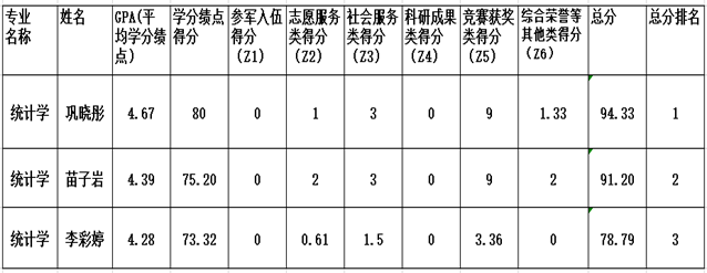 根据教务处《关于做好2024年优秀应届本科毕业生免试攻读研究生推荐工作的预通知》文件精神以及《华侨大学统计学院2024年优秀应届本科毕业生免试攻读研究生推荐工作实施细则》(统计〔2022〕20号)具体要求,经学生本人自主申请,学院推免生遴选工作小组对提交申请的学生材料进行审核、资格审核公示与综合测评,现将综合成绩结果公示如下: